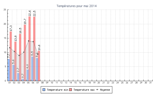 | Total | 0.7 °C | 22.6 °C | 11.2 °C | 7 km/h (31.7 km/h) | NNO |