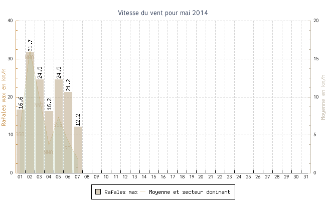 | min | max | moy | Vitesse (rafales) | Secteur | ||